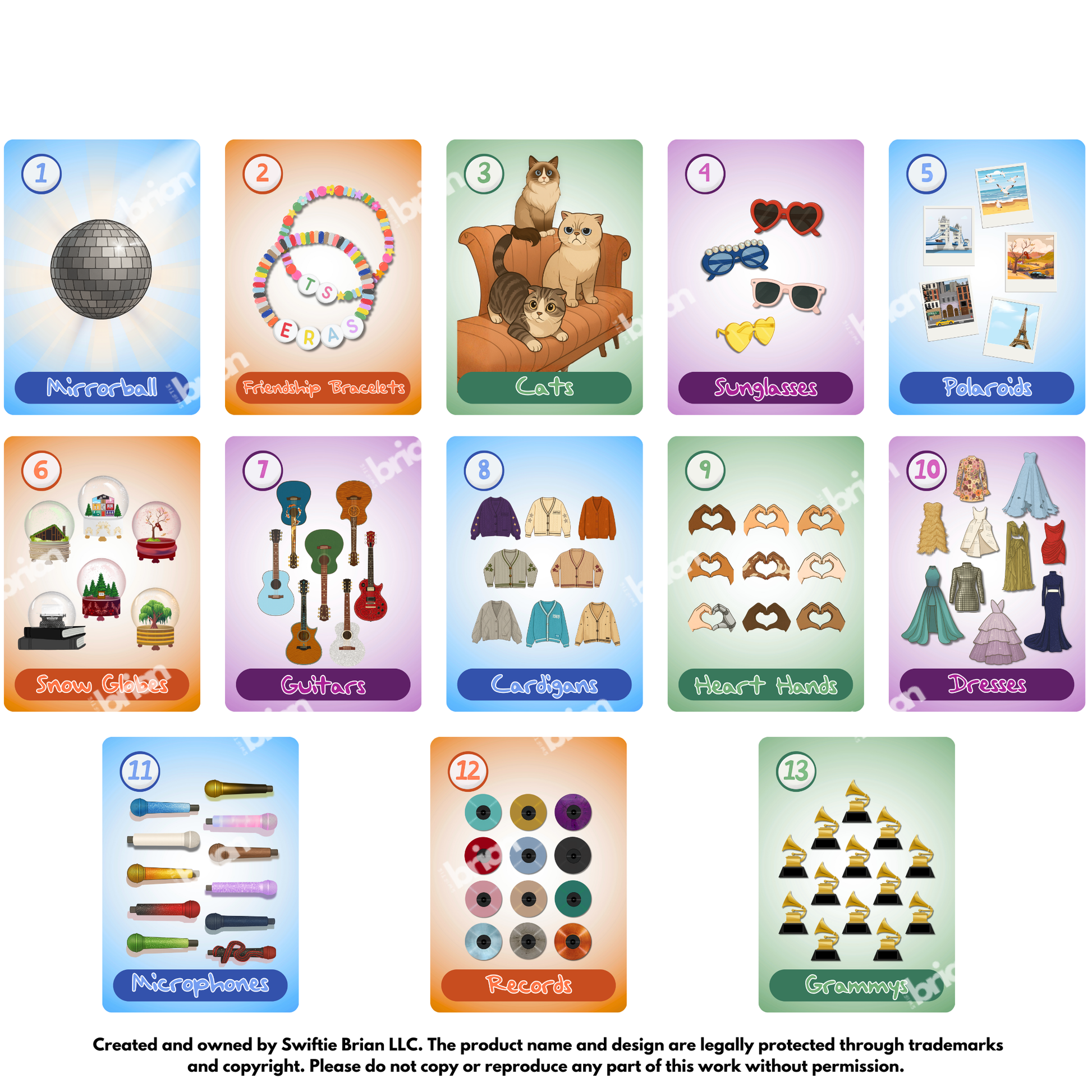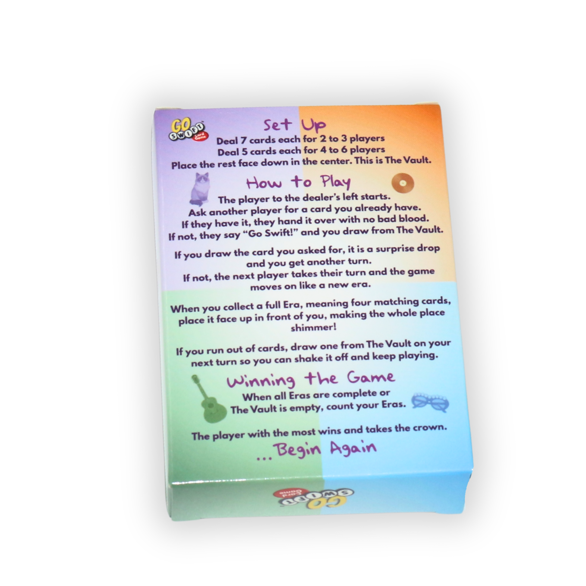 Step into a colorful new era of game night with Go Swift. This adorable fan inspired card game brings all the fun and nostalgia of classic Go Fish into a bright Swiftie coded world filled with friendship bracelets, cardigans, cats, snow globes, Polaroids, sunglasses, mirrorballs, and so many more little things that Taylor fans love.
